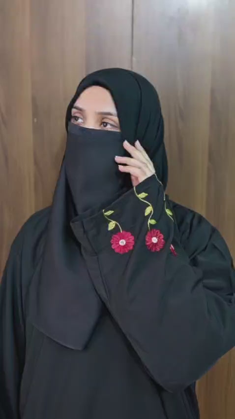 This graceful black abaya is designed for women who appreciate timeless elegance with fine detailing. The minimal silhouette is beautifully enhanced with delicate floral embroidery on the sleeves, making it perfect for both everyday wear and special occasions.