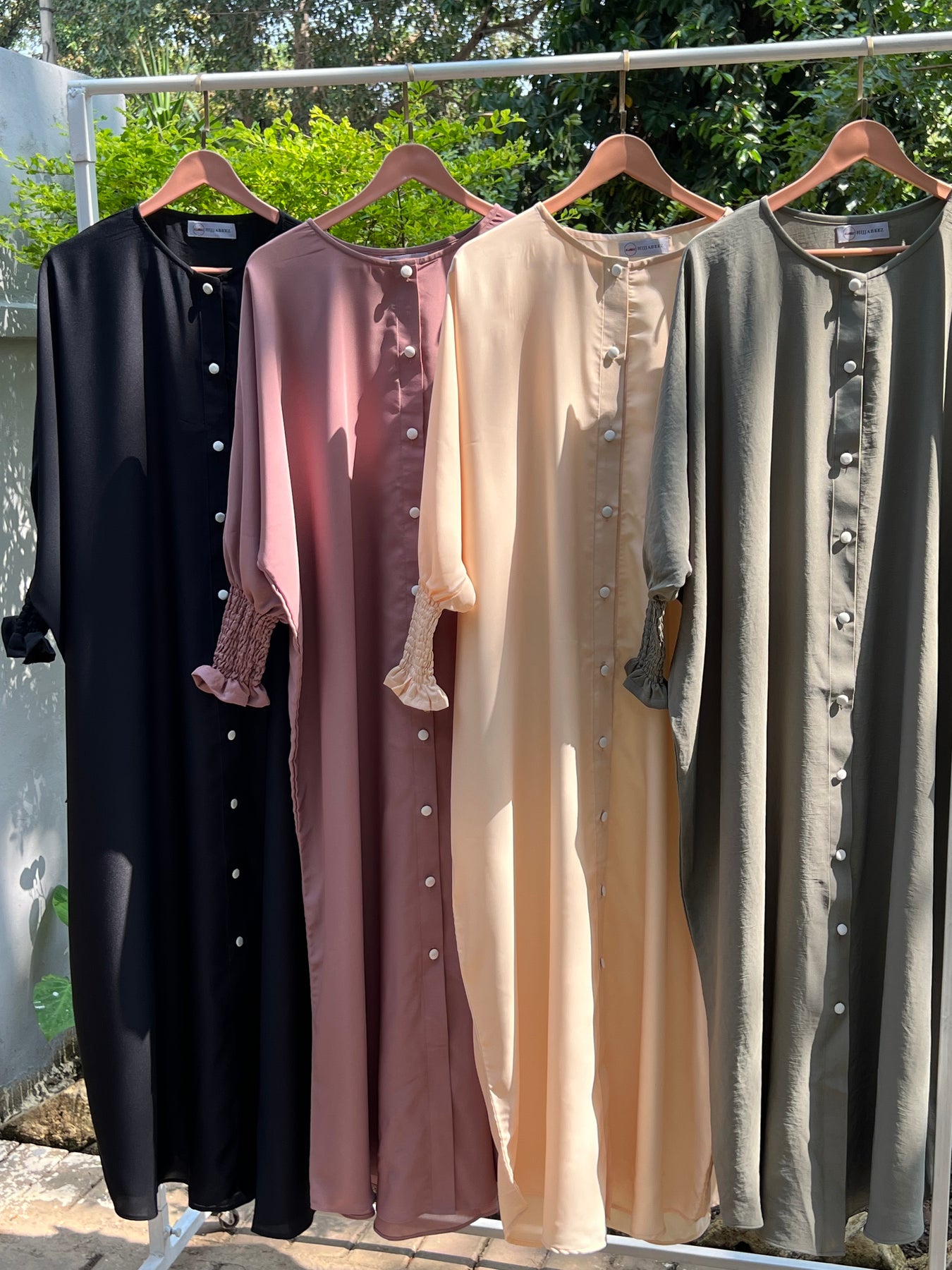 • Elegant front-open abaya with full button-down design.